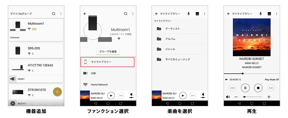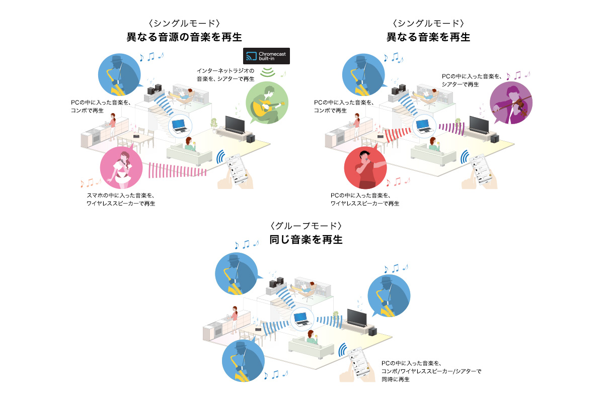 スマートフォンで「Music Center」アプリを操作することで、各部屋で同じ音楽を再生したり、異なる音楽を再生したり、異なる音源の音楽を再生したりできます。異なる部屋の「ワイヤレスマルチルーム」に対応したオーディオ機器を操作して、PCやNASに保存した音楽や、ミュージックサービスの音楽をそれぞれの機器で再生できます。また、オーディオ機器をグループ化することも可能。グループ化したオーディオ機器が置いてある部屋で、同じ音楽を同時に再生することも可能です。