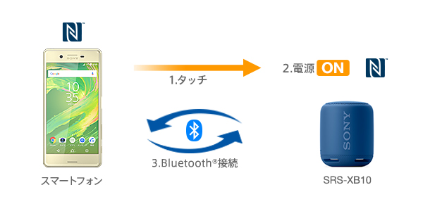 NFC搭載のスマートフォンやおサイフケータイ(R)対応Android(TM)搭載スマートフォンなどをSRS-XB10にタッチすると、SRS-XB10の電源がONになりBluetooth接続が完了します。