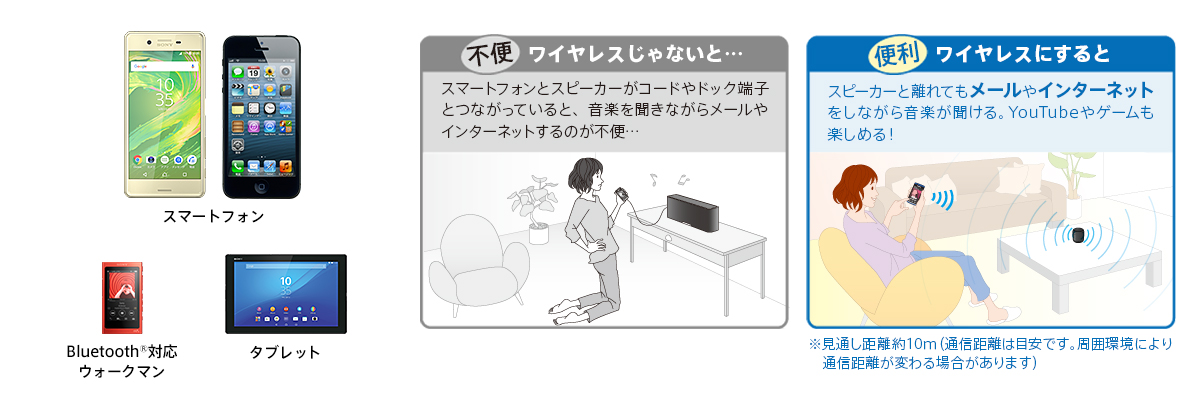 Bluetooth標準規格Ver.4.2に準拠。Bluetoothに対応したスマートフォンやウォークマン、タブレットなどとペアリングすることで、音楽・映像・ゲームをワイヤレスで再生したり、ハンズフリー通話したりできます(*)。Xperia(TM)やiPhoneなどのスマートフォン、タブレットなどで音楽を聞きながら手もとでインターネットやTwitter、Facebookなどのアプリケーションを楽しんだり、YouTube(TM)やワンセグなどの動画をスピーカーの迫力のサウンドで楽しめます。