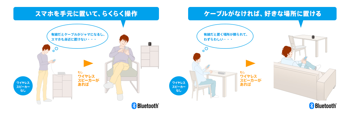 スマートフォン、iPhone、ウォークマンなどに保存した音楽やストリーミングの音楽をワイヤレスで高音質にしかも快適に楽しめます。