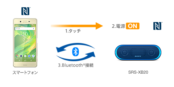 NFC搭載のスマートフォンやおサイフケータイ(R)対応Android(TM)搭載スマートフォンなどをSRS-XB20にタッチすると、SRS-XB20の電源がONになりBluetooth接続が完了します。