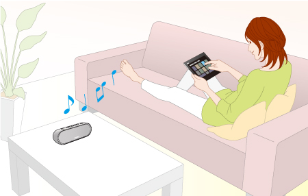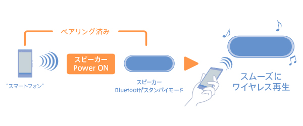 Bluetoothスタンバイ機能(*)をオンにしておけば、スピーカーの電源を切っておいてもスマートフォンで電源を入れられます。また、離れたところからでも電源を入れられるので、わざわざスピーカーまで近寄る必要もありません。外でヘッドホンで聞いていた音楽を家に帰ってスピーカーで続けて楽しむのも、この機能を使えばかんたんにすばやくできます。