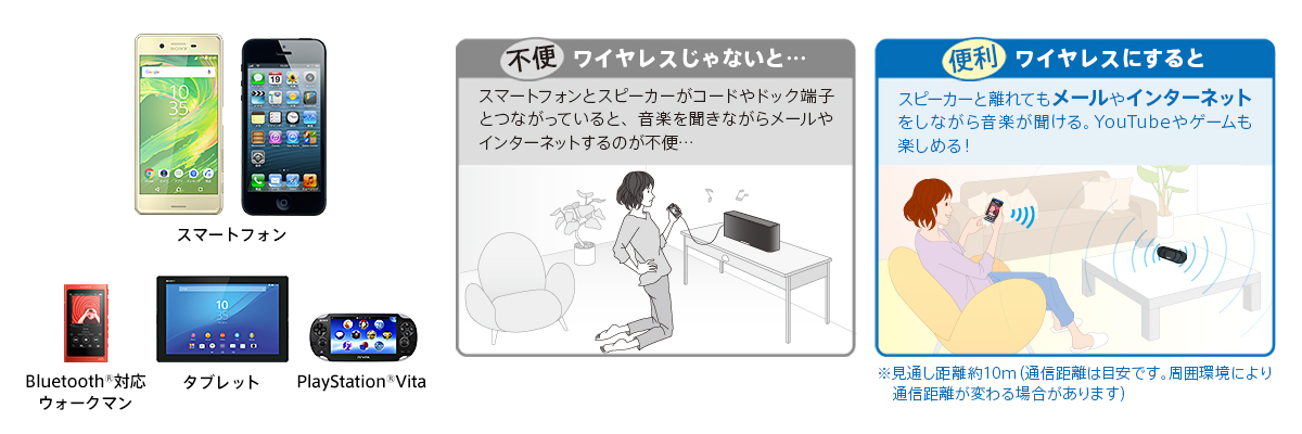 Bluetooth標準規格Ver.4.2に準拠。Bluetoothに対応したスマートフォンやウォークマン、タブレット、PlayStation(R)Vitaなどとペアリングすることで、音楽・映像・ゲームをワイヤレスで再生したり、ハンズフリー通話したりできます(*)。Xperia(TM)やiPhoneなどのスマートフォン、タブレットなどで音楽を聞きながら手もとでインターネットやTwitter、Facebookなどのアプリケーションを楽しんだり、YouTube(TM)やワンセグなどの動画をスピーカーの迫力のサウンドで楽しめます。