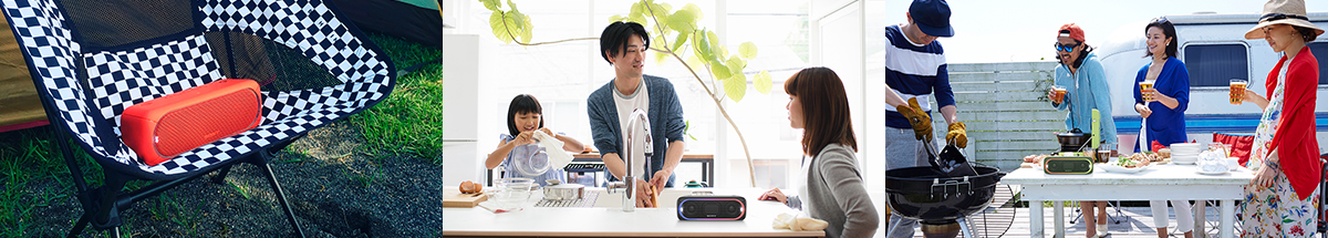 JIS防水保護等級 IPX5相当(*2)の優れた防水性能により、お風呂やキッチンはもちろん、アウトドアでも水しぶきを気にせず音楽を楽しめます。また、4時間の充電で最長24時間再生(*3)できるバッテリーを内蔵。キャンプやバーベキュー、友人とのパーティーなどに持って行ってもバッテリーを気にせず安心して使用できます。