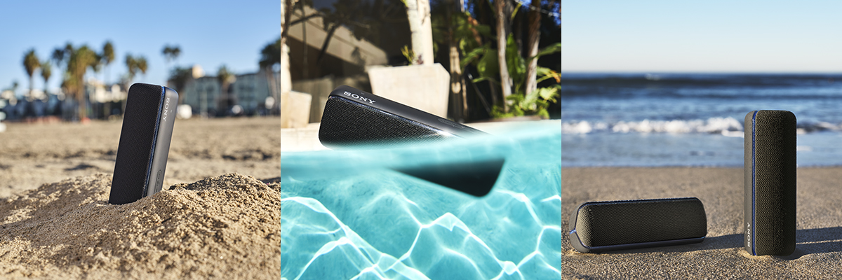防水(*1)対応で、お風呂やキッチンでも音楽を楽しめます。防塵(*2)対応かつサビにも強いので、海やアウトドアでも使えます。IP67(*1)(*2)に対応。また、5時間の充電でStandardモード時には24時間再生(*3)、EXTRABASSモード時には14時間再生(*4)ができるバッテリーを内蔵。バッテリーを気にせず安心して使用できます。