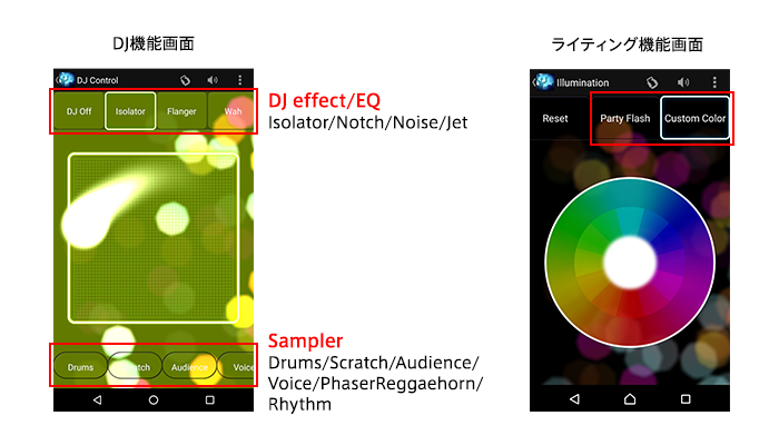 楽曲に合わせてドラムやスクラッチ等を入れて楽しめるDJ機能や、ライティング機能の変更ができます。