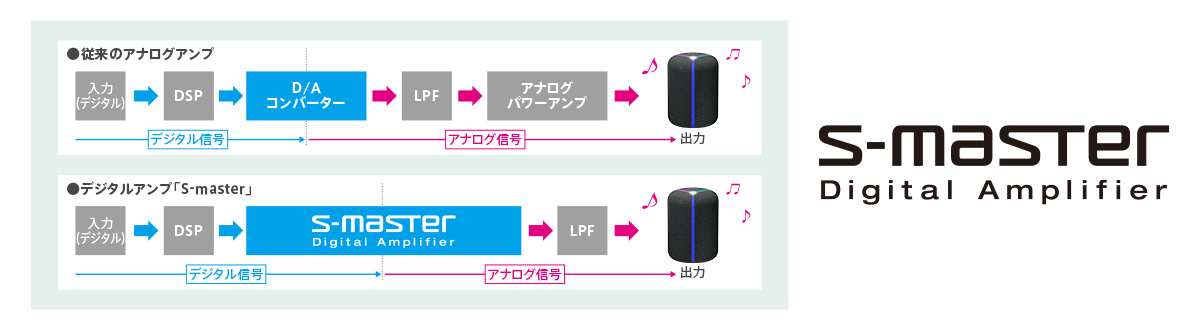 ソニーが培ってきた高音質デジタルアンプ技術「S-Master」を搭載。音声信号をデジタル処理することにより、音のひずみを抑制。小音量から大音量までどのボリュームレベルでも、クリアで臨場感あふれるサウンドを再現します。また、高効率なスイッチング方式の採用により発熱が少なく、アンプ部の小型化が可能になりました。
