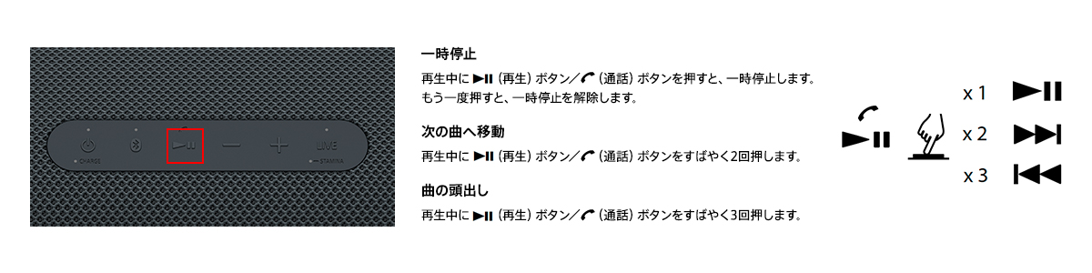 *1 サウンドモードをSTAMINAモード、Lighting Off時、音量は約半分で使用の場合。工場出荷時の設定からサウンドモード、Lightingを切り替える必要があります。切り替え方法は、取扱説明書やヘルプガイドでご確認ください。音量や再生楽曲、周囲の温度など使用状況により、記載の時間と異なる場合があります