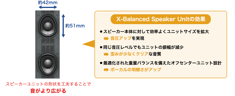 約42×51mm口径の非対称形フルレンジスピーカーユニット「X-Balanced Speaker Unit」を2基搭載。スピーカー筐体のサイズはコンパクトなままに、高音質、高い音圧と力強い低音を実現。ソニーならではの高音質で大好きな音楽をより楽しむことができます。