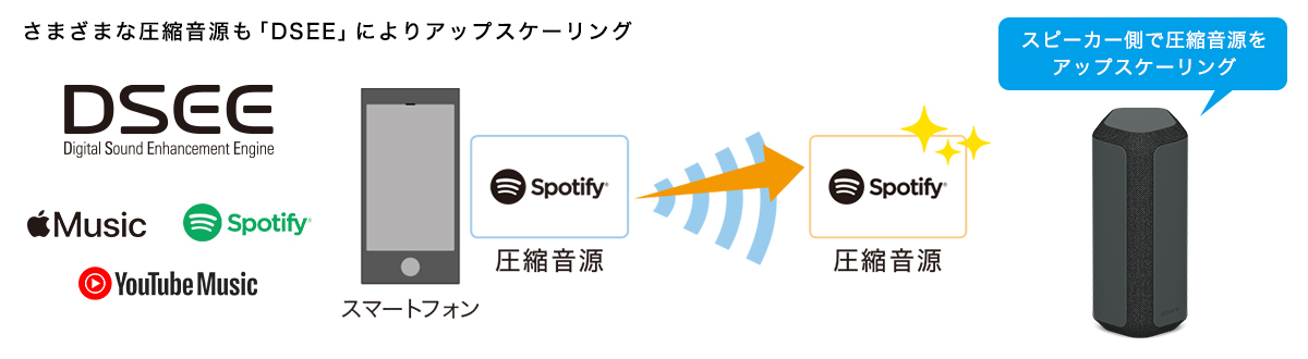 圧縮された音源で失われがちな高音域を効果的に補完しクリアに再現する「DSEE」。音楽配信サービスなどの圧縮された音源を原音により近い広がりのある音で再生します。圧縮率を上げても音質劣化が少なく、聞き疲れしにくい音で楽しめます。