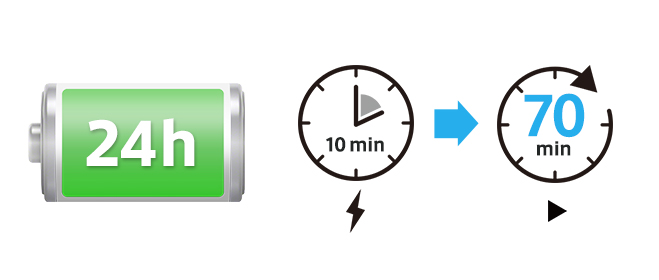 約5時間の充電で(*1)STAMINAオン時には約24時間再生(*2)できるバッテリーを内蔵。リビングやキッチン、お風呂はもちろん、ビーチやキャンプ、バーベキューなどに持ち運んでも、バッテリーを気にせず長時間使用できます。また、約10分の充電で約70分再生可能な急速充電(*3)にも対応。
