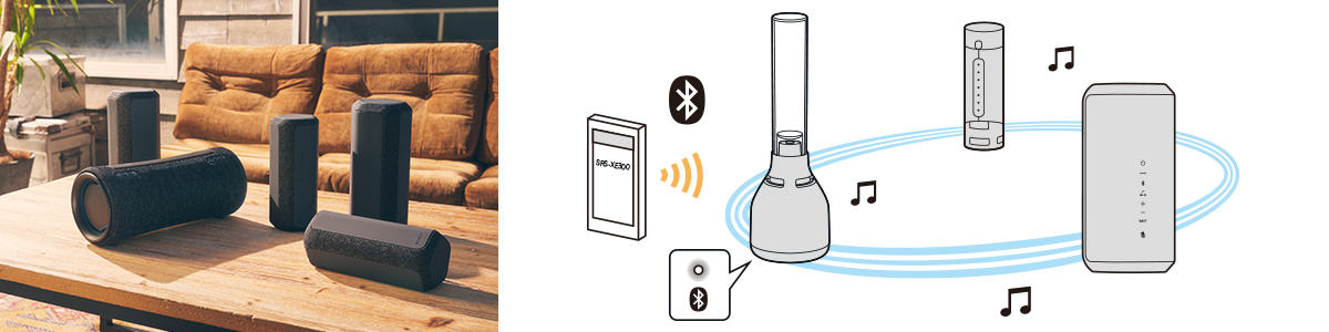 SRS-XE300を2台一緒につなげてBluetooth(R)接続することで、ステレオで音楽を楽しめます。