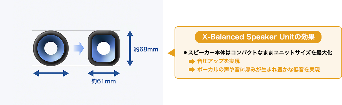 スピーカー本体はコンパクトなまま、スピーカーユニットの形を変えることでユニットサイズの最大化を実現。さらに、矩形ウーファーの採用により、圧倒的な音圧と厚みのあるボーカル、豊かな低音を実現。