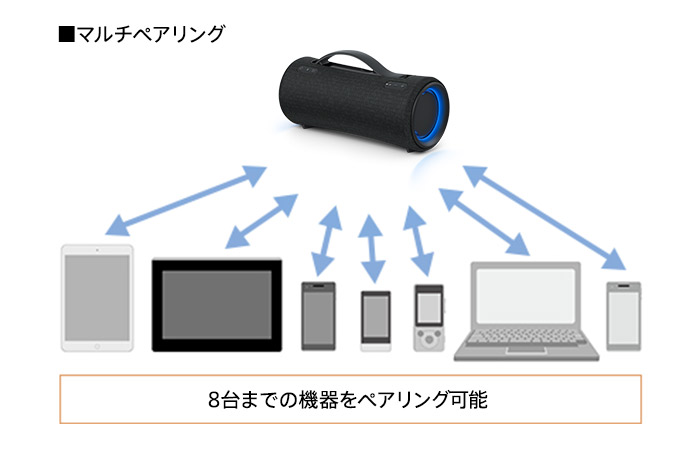 8台までの機器とペアリングできるマルチペアリングに対応。よく使う機器と一度ペアリングしておけば、2回目からのBluetooth接続がかんたんになります。