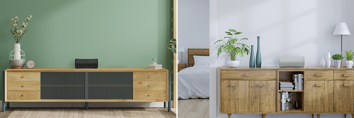汚れや傷に強く高い耐久性を持つファブリック素材を採用。インテリアとの親和性を重視したデザインでどんなお部屋にもなじむスピーカーに。