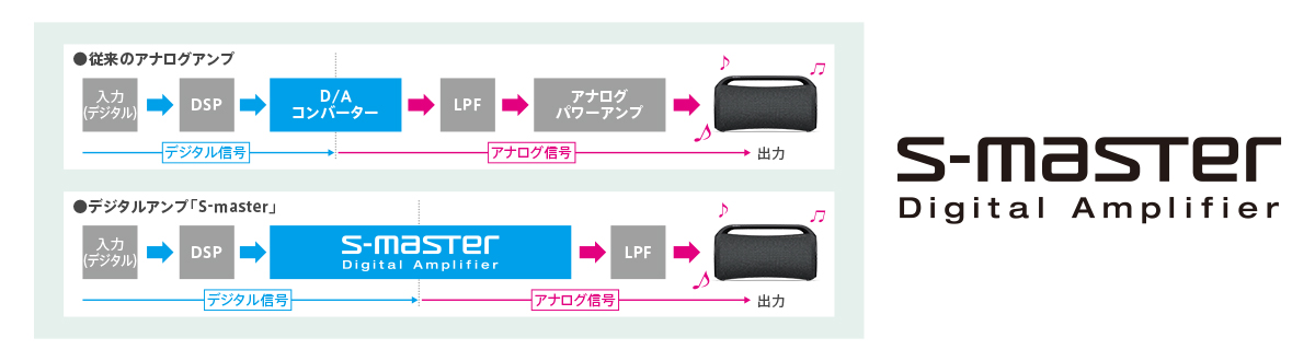 ソニーが培ってきた高音質デジタルアンプ「S-Master」を搭載。音声信号をデジタル処理することにより、音のひずみを抑制。小音量から大音量までどのボリュームレベルでも、クリアで臨場感あふれるサウンドを再現します。また、高効率なスイッチング方式の採用により発熱が少なく、アンプ部の小型化が可能になりました。