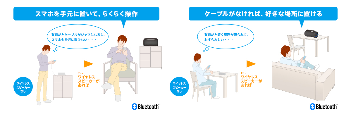 スマートフォン、iPhone、ウォークマンなどに保存した音楽やストリーミングの音楽をワイヤレスで高音質にしかも快適に楽しめます。