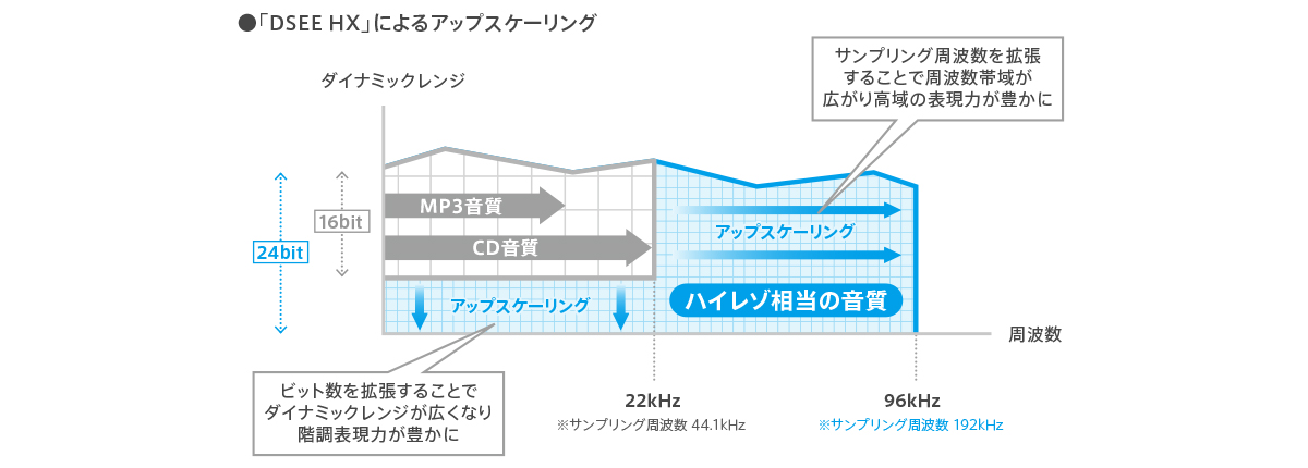 ※ 初期設定は「オート」です。圧縮音源は「DSEE HX」によって高音質化され、ハイレゾ音源はそのままの音で出力されます