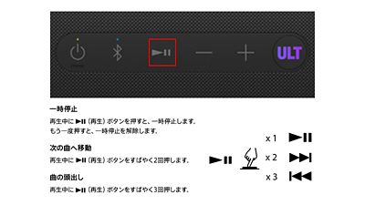 スピーカー本体の操作ボタンで再生/一時停止、曲送り/曲の頭出しが可能。スマートフォンが近くになくても操作ができます。