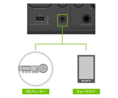 オーディオ入力端子やUSB端子搭載でその場・その人に合った音楽の再生が可能です。また、マイク/ギター端子を搭載し、音楽を流しながらのマイクを使ったカラオケや、ギターの演奏なども可能。