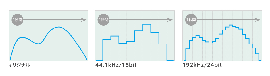 一般的にオーディオ用のデジタル信号は、原音となるアナログ信号を一定時間ごとに標本化(サンプリング)し、それを量子化することで作られます。サンプリング周波数とは、1秒間に何回標本化作業を行うのかを表すもので、単位は「Hz」です。サンプリング周波数が高いほど得られる情報が多くなり精度は上がります。サンプリングされた時点でのアナログ信号レベルをデジタルデータで表現することを量子化と言いますが、どれくらいの精度で読み取るのかをビット数で表しており、単位は「bit」です。bit数が高いほど、原音からより忠実に変換することが可能となります。サンプリング周波数とbit数それぞれの数値が大きくなるほど、原音の再現性に優れ、微細な音の変化や音の余韻までも表現することが可能となります。