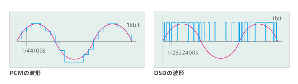 ハイレゾ音源とは、CDの「44.1kHz/16bit」規格を超えるものを指し、「96kHz/24bit」と「192kHz/24bit」が主流になっています。アナログ信号をデジタル化するこの手法をPCM(pulse code modulation)方式またはリニアPCMと呼んでいます。また、デジタルに変換する別の手法としてDSD(Direct Stream Digital)方式もあります。スーパーオーディオCD(SA-CD)に採用された1ビットデルタシグマ変調のデジタル記録方式で、サンプリング周波数はCDの64倍の2.8224MHzや128倍の5.6648MHzがあります。DSDはPCM方式よりもよりアナログ音源に近いデジタル記録ができることが特長です。