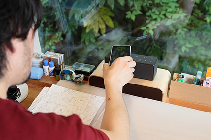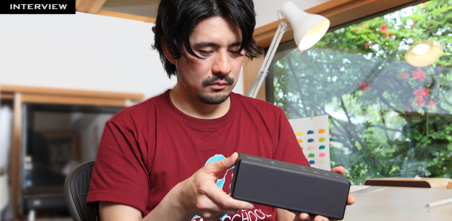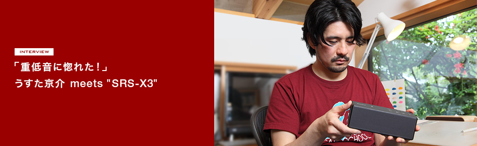 うすた『SRS-X3』の良いところは、まず置き場を選ばないこと。今使っているスピーカーは作業机の左隣にあるパソコンに繋がっているので、音が左側からしか聞こえてこないんですよ。でもワイヤレスの『SRS-X3』なら原稿を描いている時、パソコンで調べ物をしている時、ソファで休憩している時、その時々でベストなポジションに置いておけますよね。お気に入りアイドルの歌をスタッフに聴かせたい時はそっちに向けて置くなんてこともできちゃう(笑)。サイズも小さいのでちょっとした空きスペースにすぽっとはまります。どこから音が出てるかわからないくらい小さいし、それくらい溶けこんでいる。机の上に物が多いので、これはうれしいですね