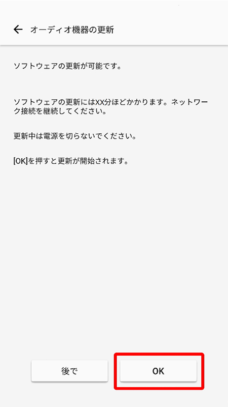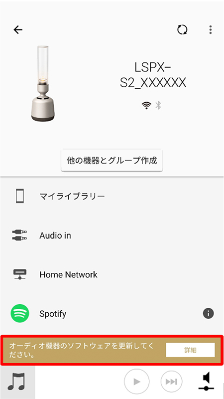 5 アップデートが存在する場合は、「オーディオ機器のソフトウェアを更新してください。」と表示されます。「詳細」を押下します。