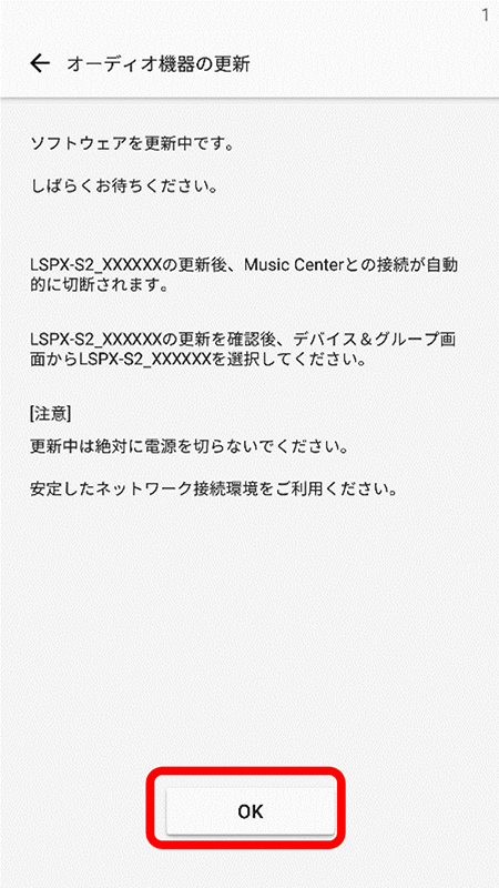 6 「ソフトウェアの更新が可能です。」と表示されていることを確認し、「OK」を押下します。アップデートが開始されます。