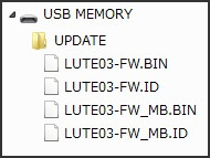 ”UPDATE”フォルダの中にある”LUTE03-FW.BIN”、”LUTE03-FW.ID”、”LUTE03-FW_MB.BIN”、”LUTE03-FW_MB.ID”の4つのファイルがアップデータになります。