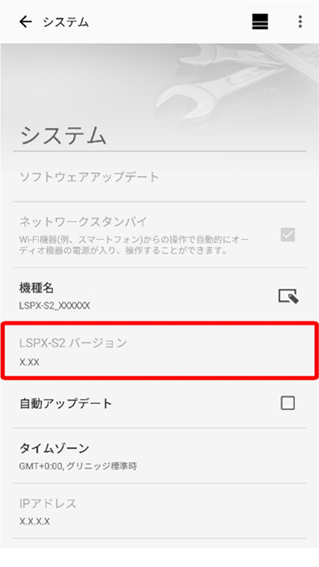 「Sony | Music Center」アプリとバージョン確認を行うLSPX-S2と接続してください。