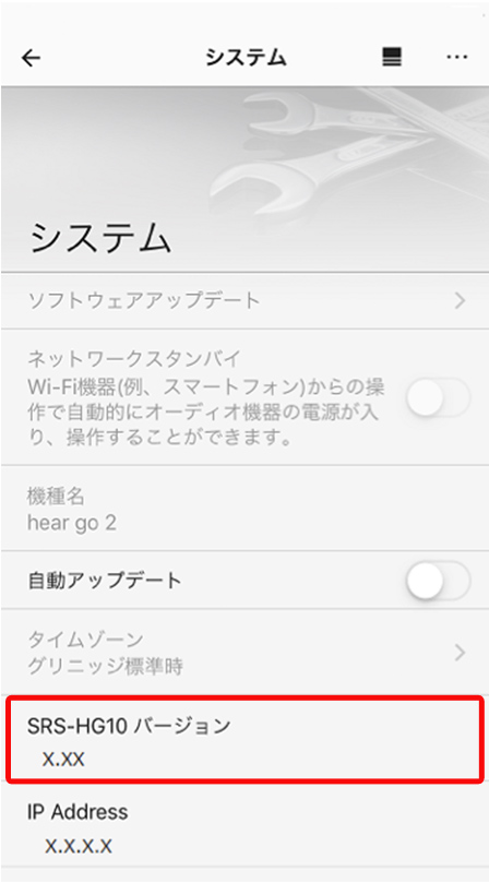 バージョンの確認を行ってください(“SRS-HG10 バージョン”の下にある数字が、バージョンです)