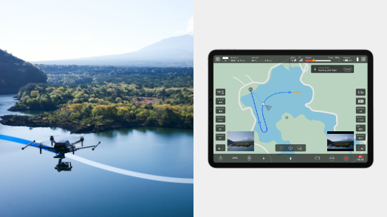 過去の飛行ログから飛行ルートとジンバル&カメラの動きをトレースする「再現飛行」に対応。飛行ログをミッションに変換して同じルートを飛行させたり、ミッションに変換することなく飛行ログを利用して即座に飛行させる「ダイレクト再現飛行(*1)」を実施できます。定点で撮影を続けるなど、同じフライトを繰り返したい場合に活用できます。また、飛行のみならず静止画及び動画の撮影タイミングも再現させることが可能です(*2)。ミッション飛行中や再現飛行中にもマニュアル操作が可能なので、ルートの微修正やジンバルの角度変更など、実際に飛行させながら細部まで調整が行えます。