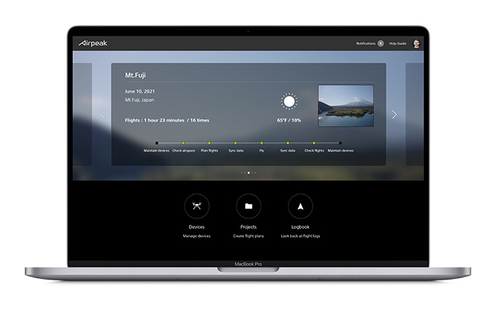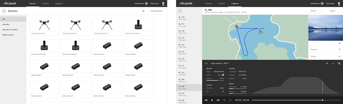 「Airpeak Base」は飛行プラン、飛行ログ、機材をまとめて管理できるWebアプリです。緻密な飛行ルートのセッティングが行えるほか、過去の飛行ログも閲覧可能。それらの記録を元に新たな飛行プランの作成がアプリ上で一貫して行えます。また、機材の使用履歴や状態もチェックでき、エラー通知や必要に応じて点検の案内も。現場到着後の思わぬ機材トラブルを減らすことができます。各種データはアカウントごとに管理されているため、セキュリティ面でも安心です。