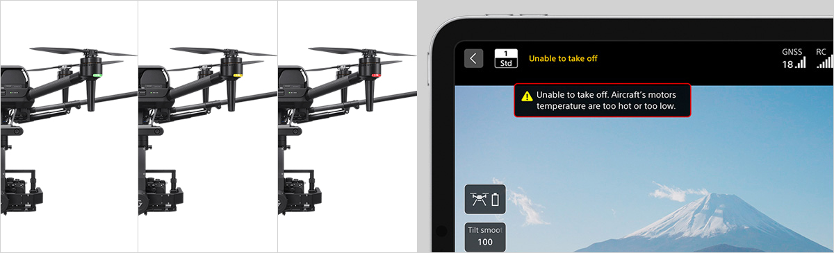 モーター始動前に全システムの正常動作を自動的に確認。異常のある場合は操縦者にアラートし、必要に応じて離陸を制限します。飛行中も常に機体の状態を自己診断しており、万が一異常が発生した場合は、操縦者に直ちに通知した上、緊急着陸などの対応を行います。