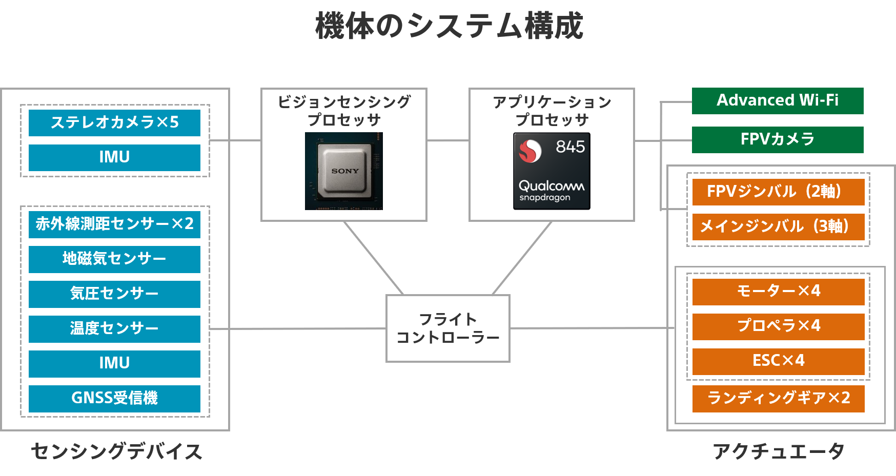 広野「Airpeak S1」の機体制御システムは大きく3つのマイクロプロセッサで構成されています。自律飛行や撮影機能などの上位アプリケーションとシステム全体を制御するアプリケーションプロセッサ、機体の姿勢や運動を制御するフライトコントローラー、そして大量の映像情報から機体の制御に必要な位置・周囲状況を判断するビジョンセンシングプロセッサです。