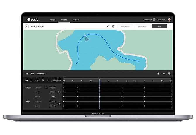 そうして蓄積した飛行ログとお客様のインターフェースとなるのが「Airpeak Base」です。「Airpeak Base」には大きく3つの機能があります。1つ目が、機体、送信機、そしてバッテリーといった機材を管理する「デバイス」、2つ目がドローンの飛行プランを作成する「プロジェクト」、3つ目が過去の飛行ログを閲覧する「ログブック」です。
