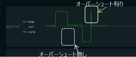 オーバーシュートが発生した場合はBASIC設定画面のTILTの値を上げ、再びTILT軸を+10度動かしてオーバーシュートが無くなることを確認します(1回に値を上げる量は5程度にします) 。