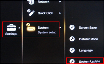 ・本機のメニュー画面で [Settings] - [System] - [System Update] を選択する。