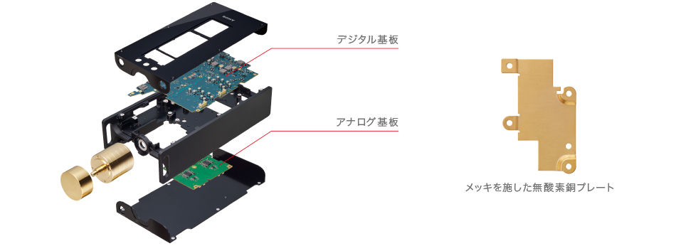 アナログ基板とデジタル基板をH型シャーシの上下面で物理的に分離。各基板の表面に充分な接触面積を取りシャーシに接地することでグラウンドを強化し、音質に与えるノイズを低減しています。また、デジタル基板のマウントには金メッキを施した無酸素銅プレート(純度99.96%以上)を採用。抵抗値を大幅に低減しデジタル部のグラウンド安定性を高めるとともに、金メッキにより接触抵抗低減と酸化防止を図っています。さらに、無酸素銅プレートとシャーシの間に鉄製のプレートを挟み、複数の導体により表面積を大きくすることでグラウンド安定性に寄与しています。
