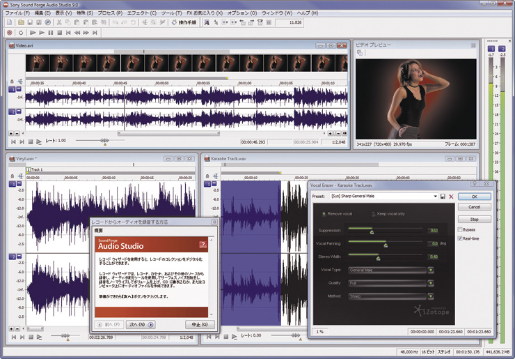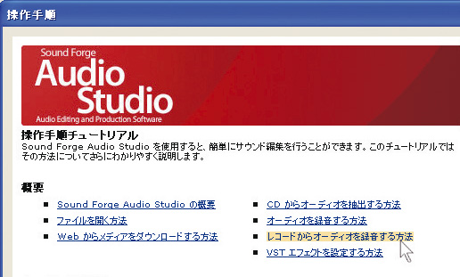 「Sound Forge Audio Studio LE」は、パソコン上でオーディオの取りこみや編集、ATRAC形式やMP3形式などへのエンコード、CD-RやCD-RWへの録音が行える高機能なマスタリング用ソフトウェア。非圧縮での高音質な取りこみにも対応しており、アナログレコードならではの柔らかい音の質感までパソコンに取りこめます。また、アナログレコードを再生する際のノイズを録音時に軽減するツールも備えています。これらの作業は、手順を分かりやすく案内する操作手順チュートリアルのリストから選択していくだけで容易に進められ、貴重なレコードコレクションを効率よくCD-RやCD-RWに録音できます。このほか、イコライザーやディレイ、リバーブ、コーラスなどの豊富なエフェクトにより、取りこんだ楽曲データを好みに合わせてカスタマイズできます。不要な部分を削除したり、気に入った曲をフェードイン・フェードアウトさせてビデオ作品の音素材にするような高度な編集も、ドラッグ アンド ドロップのわかりやすい操作で簡単に行えます。