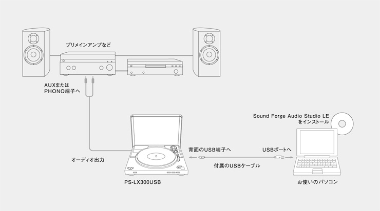 昔、集めていたアナログレコードの音を再び楽しみたい。アナログ音声ならではの豊かな音色をそのままCDに保存したい。PS-LX300USBなら、アナログレコードの楽しみ方がさらに広がります。通常のオーディオ出力端子に加え、パソコンと容易に接続できるUSB端子を装備。この端子からレコードプレーヤーのステレオ音声をデジタル出力し、簡単にパソコンに取りこめます。取りこんだ楽曲データをCD-RやCD-RWに録音すれば、CDプレーヤーなどで再生可能。摩耗や劣化の心配をせずに、アナログレコードの貴重な楽曲を楽しめます。
