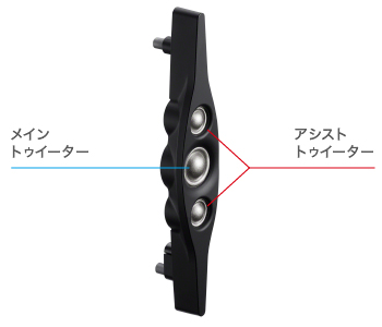 「I-ARRAY(TM) System」はメイントゥイーターと、それを上下で挟むようにレイアウトされた2つの小口径アシストトゥイーターで構成し、3つのトゥイーターをあたかも1つのトゥイーターのように機能させる技術です。3つのトゥイーターを単純に並べると、音波が相互に干渉し周波数特性に激しいピーク・ディップが発生しますが、「I-ARRAY(TM) System」はコンピューターによる高精度物理シュミレーションによって相互干渉が発生しないレイアウトを実現しています。メイントゥイーターは口径が大きく音圧も高く、音楽性豊かな高域再生を実現します。アシストトゥイーターは指向性が広く、かつ100kHz再生を実現します。両者の良いところを合わせることで、自然で広い指向特性と広帯域性能を両立しています。