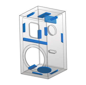 エンクロージャーの響きをコントロールし不要なノイズを排除することは、広いサウンドステージと緻密な音像定位、高品位なボーカル帯域の再生を実現するうえで重要な要素です。SS-CS5では、エンクロージャーの響きをコントロールするためにユニットの背圧やエンクロージャー内部で発生する定在波を抑制する「吸音」と、エンクロージャーそのものの振動を抑制する「制振」の2つに分類し、それぞれアプローチを変えて対策を施しました。吸音材の材料の種類や位置、また補強の入れ方を、何度も試作と試聴を繰り返す事で最適に調整しています。