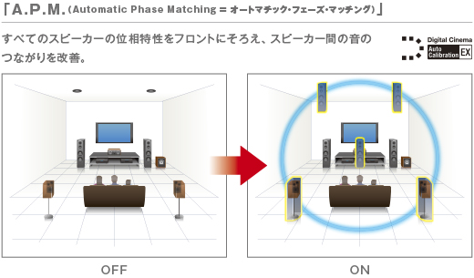マルチチャンネル再生はフロント、サラウンド、センター、トップの全てのチャンネルに同じスピーカーを用いて音圧と位相の両方の周波数特性を一致させておくことが理想です。しかし家庭では、異なるスピーカーを使うケースがほとんどです。自動位相マッチング機能「A.P.M.(オートマチック・フェーズ・マッチング)」は、フロントスピーカーと異なるスピーカーをサラウンドやセンターに使った場合でも、位相特性をフロントの特性に合わせて揃えることでチャンネル間の音のつながりを向上させる技術です。すべてのスピーカーをフロントスピーカーで構築したかのような、つながりのあるサラウンド空間を再現します。フロントスピーカーの特性は変更せず他のスピーカーの位相特性だけを補正するので、フロントの音質への影響なく壁反射による位相の乱れ、ホーン型/コーン型/ドーム型といったスピーカーの形式の違いに起因する位相特性のずれも正確に補正します。
