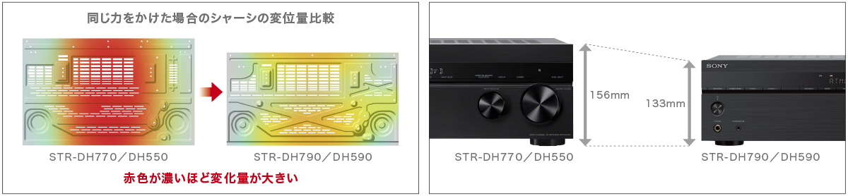STR-DH790では、耐振性に優れたFBシャーシにXエンボスデザインを採用 。Xエンボス加工によって設けられたビーム(梁)が、これまで以上にトランスやヒートシンクの重量を強固に支えるとともに、スピーカーからの音圧など外部の力からの影響を最小にし、アンプ回路への不要な振動の伝播を遮断するように最適な配置としています。高剛性化と厳重な振動対策により、豊かな量感と歯切れ良い音の再現を両立しています。