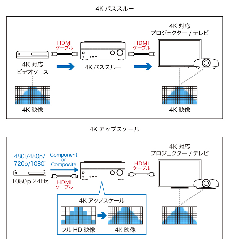 HDMI入力は、これまでの3D映像信号に加えて、4K映像にも対応(*2)。映像機器からの4K信号をパススルーし、4K対応のテレビやプロジェクターなどへそのまま信号を出力できます。また、アナログ/HDMI入力を4K信号にアップスケールしてHDMI出力できる「4Kアップスケール」機能も採用。従来のアナログ映像をよりなめらかで奥行きのある映像で楽しめます。