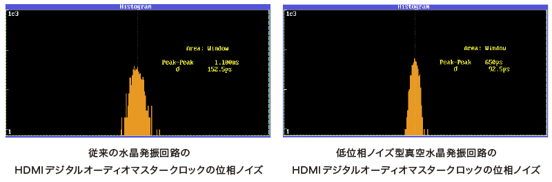 HDMIのデジタルオーディオのマスタークロック用に真空で密閉された水晶振動子を採用し、発振効率を上げ位相ノイズを低減しています。また、回路構成を吟味する事で、従来の水晶発振回路に比べて位相ノイズを約40%削減しました。HDMI音声のマスタークロックのジッタを抑えることで、音場透明性と明瞭なフォーカス感が得られます。さらに、内部の水晶の電極に機械的な振動があっても高い接触性を保ち、伝導性に影響をおよぼす酸化物を形成しない金蒸着を使用することで、より深い低音再生と豊かなサウンドを再現します。