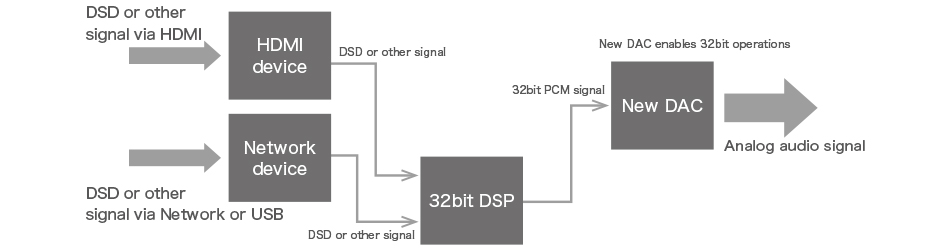 32bitで処理されたDSP出力をそのまま32bitでDA変換します。「アドバンストD.C.A.C.」「サウンド・オプティマイザー」「イコライザー」「各種サウンドフィールド」など高度なDSP技術による各機能全ての音質がグレードアップしました。