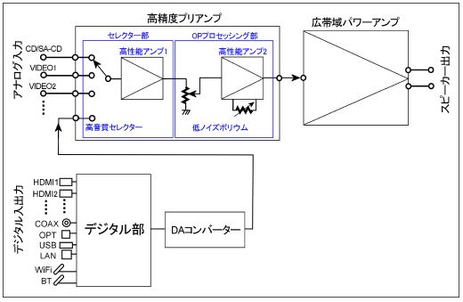 クロックジッターの影響を受けにくいスイッチド・キャパシタ方式により、小信号の歪みが少ないきれいな音質を実現し、HDMI、USB、DLNA経由でのDSDの高音質を損なわずに、最大でDSD5.6MHz 5.1chの再生が可能です。
